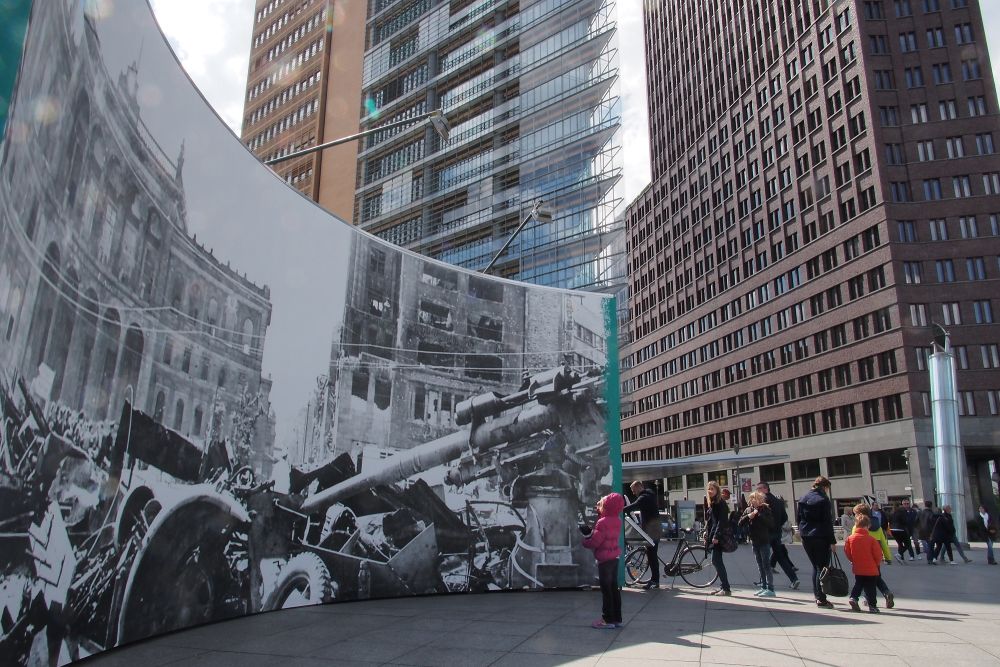 2015年5月1日,人们在德国柏林勃兰登堡门前广场上观看“战争与和平间的日常生活”露天图片展。(班玮 摄)